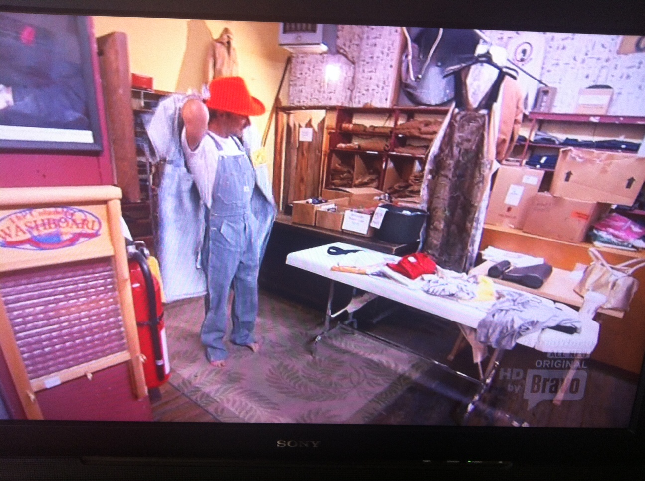 Later, in Alabama, Brad puts together a Canadian Tuxedo by pairing an acid-washed trench coat and light hickory striped denim overalls.