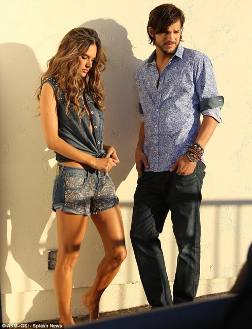 Just one month after giving birth to her second child, Alessandra Ambrosio wows in studded Colcci denim shorts and sleeveless shirt for the Brazilian line’s upcoming ad campaign. She’s seen here with Ashton Kutcher at the shoot in Marina del Rey.
