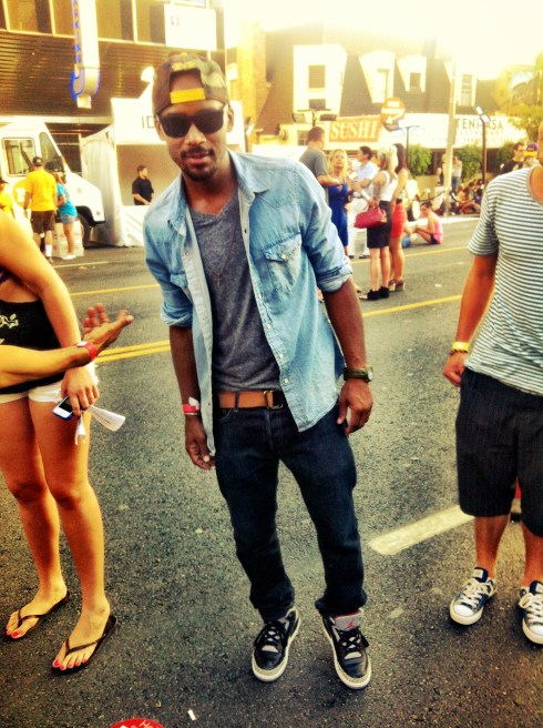 Another guy braved the sweltering Los Angeles heat and rocked out in double denim at the Sunset Strip Music Festival. Here is Alfonzo in Paper Denim jeans and an & Shirt denim top.