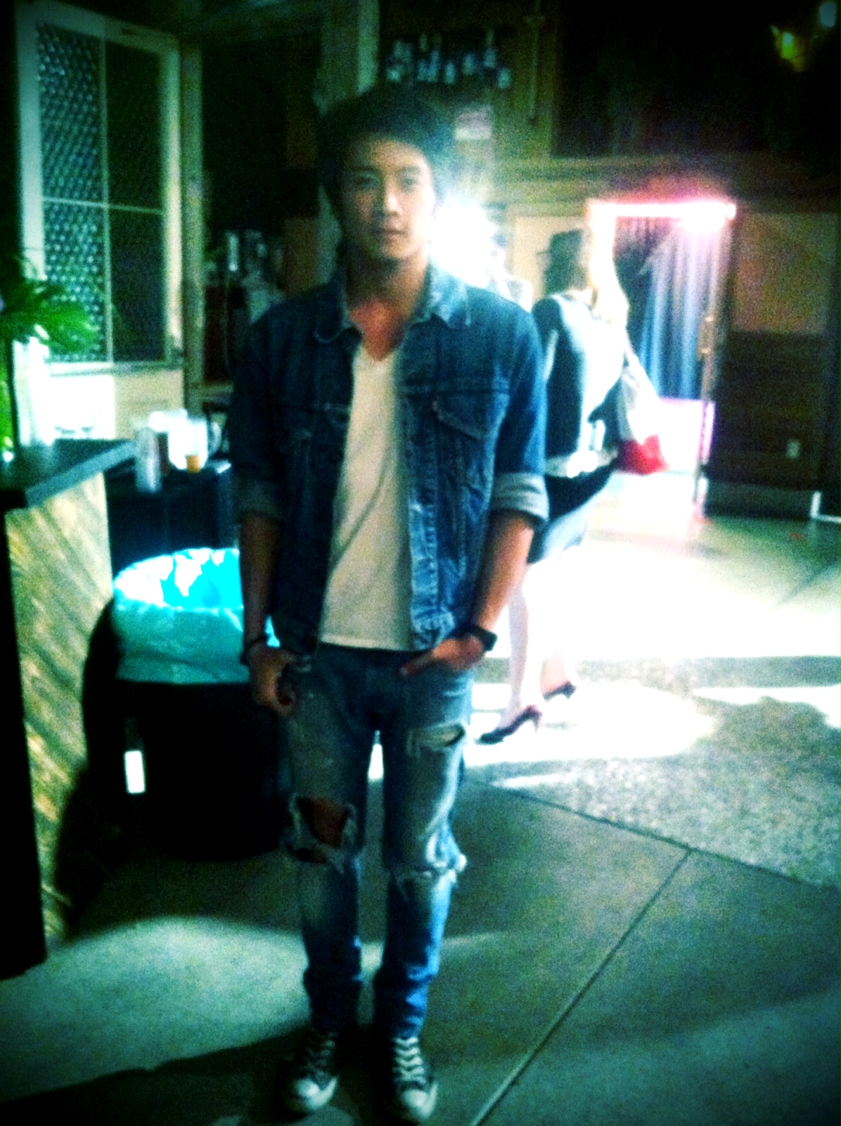 I instantly noticed The Hobbyists‘ Peter Adrian – blogger, actor, model extraordinaire – in this sick Canadian Tux, Levi’s jacket, PAC Sun destroyed denim jeans and a Hanes t-shirt.
