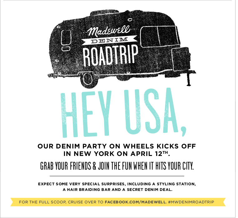 Attention America! Madewell is hitting the road in a 70s RV filled with denim and denim stylists to outfit you in the perfect wash and style. Shoppers also will enjoy special discounts and have access to a braid bar to complete your fresh boho look.