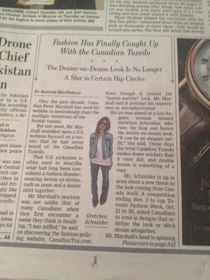 Holy sh*t! What a start to the day! Our efforts to not only support the term, but promote the double denim look, a.k.a. the Canadian Tuxedo, have hit all new highs as we found ourselves on the cover of the Wall Street Journal today! Team Tux thinks this look is amazing. And elegant. Chanel even makes Canadian Tuxedos (Thank you Uncle Karl).