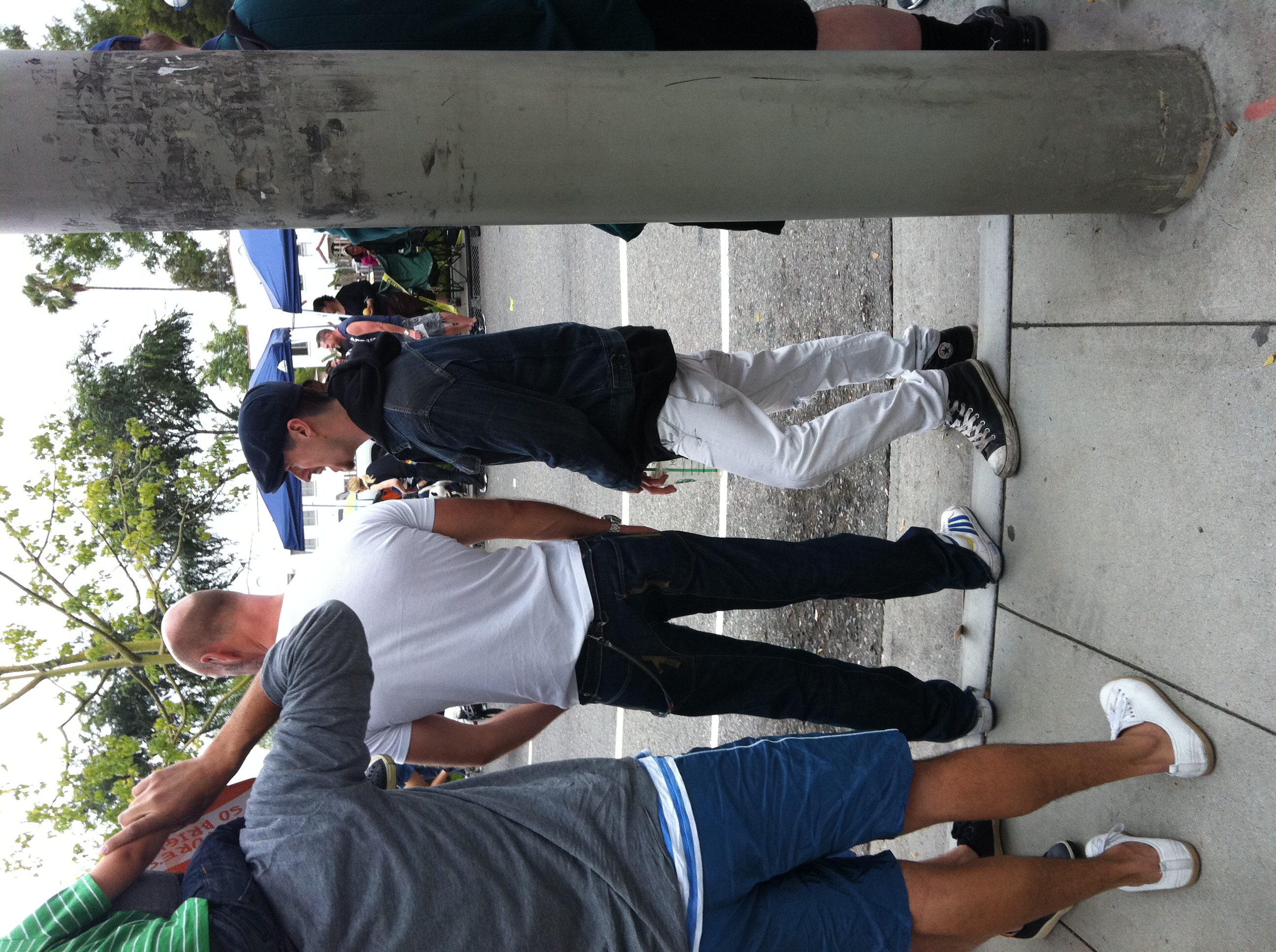 There were so many Canadian Tuxedos at yesterday’s Gay Pride Parade in Los Angeles that we lost count. We did manage to snap a couple guys draped in denim while waiting for Grand Marshall Johnny Weir to pass them by. We were hoping to see more rainbow denim, but beggars can’t be choosers.