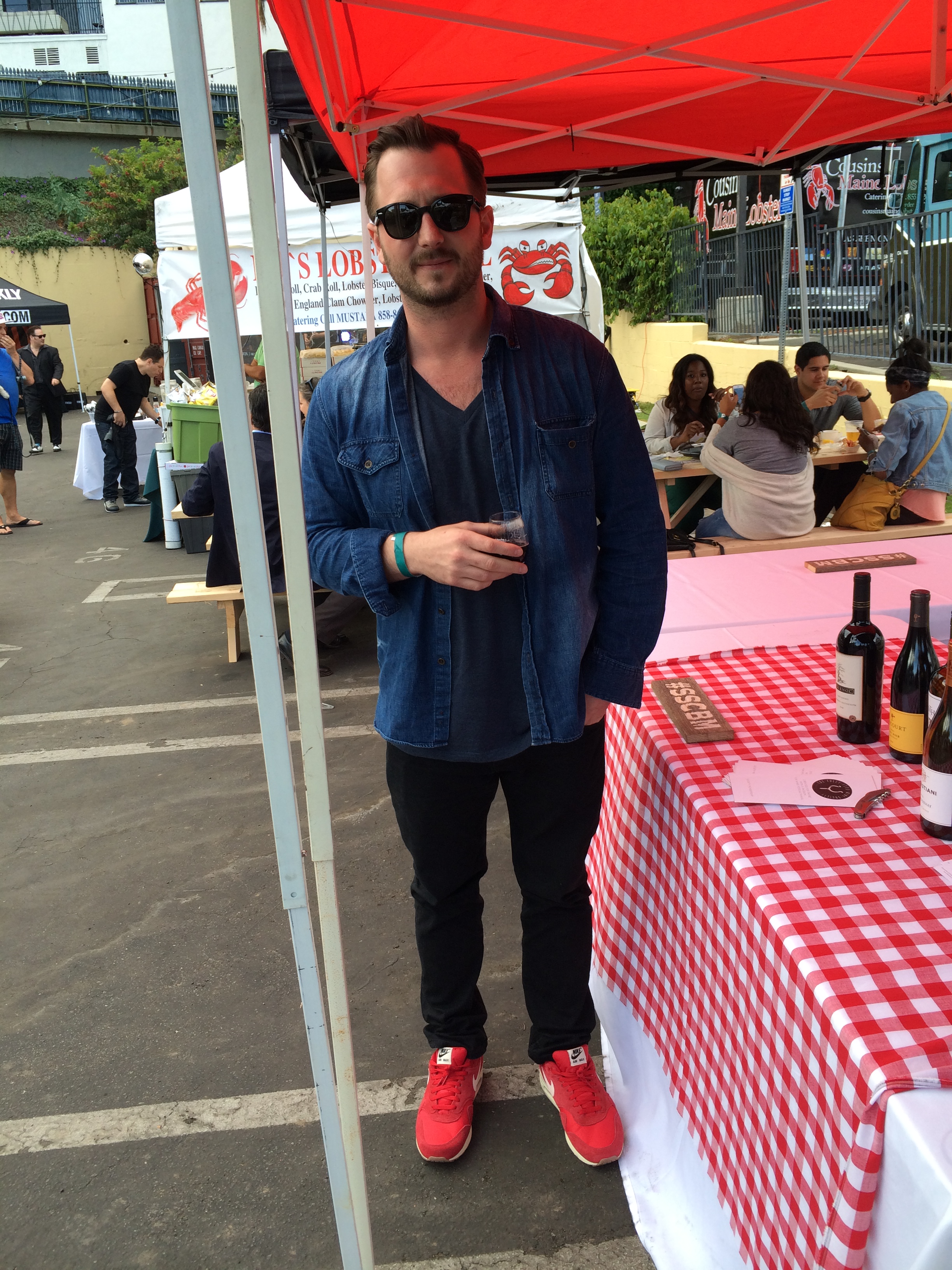 The weather cooled off just in time for double denim at the revamped Sunset Strip Market. This season they’re offering tastings from craft breweries and wineries – $16 buys you a tasting glass and set of five drink tickets. At the wine table I saw this Canadian Tuxedo: Levi’s jeans, Earnest Sewn shirt Nike Air Max kicks.