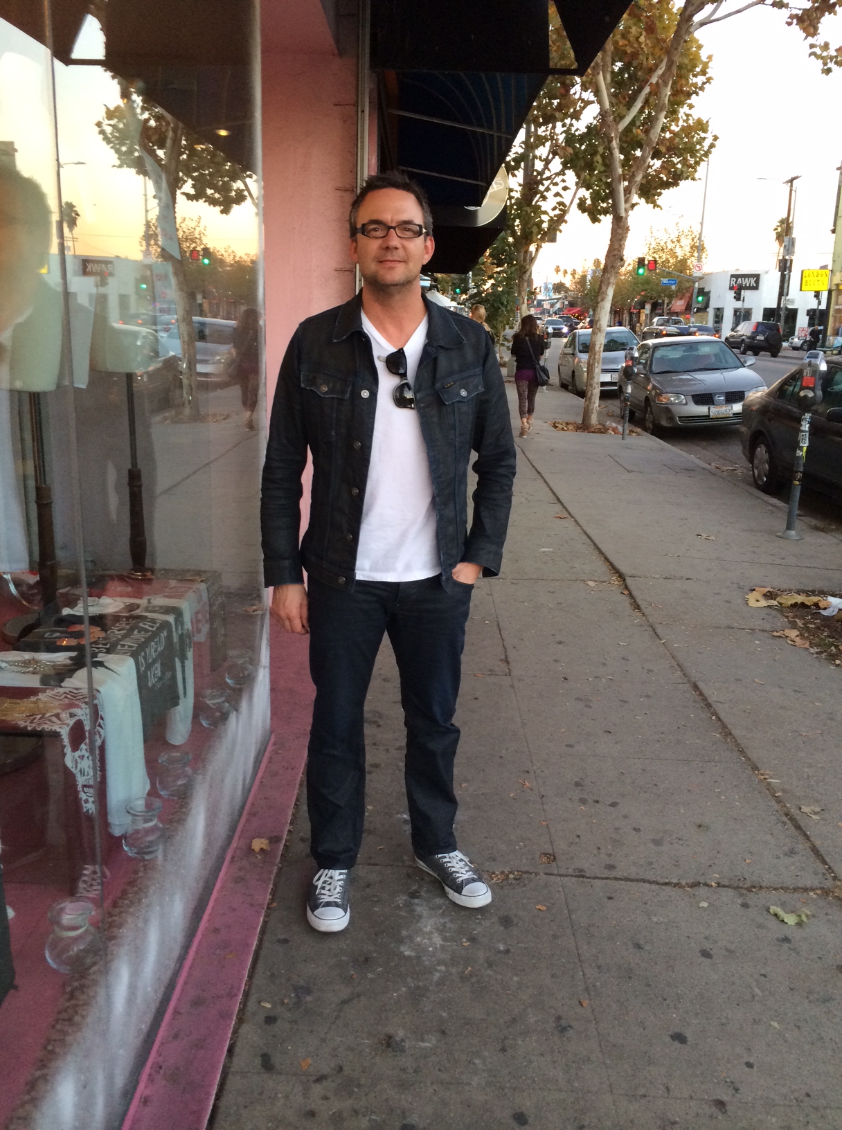 While grabbing coffee this morning, I spotted yet another incredible double denim ensemble. Here is Costume Designer Mark Avery looking dapper in a Levi’s Big E denim jacket and Jean Shop jeans.